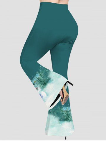 Plus Size Christmas Tree Hat Snowman Snowflake Print Flare Pants - Deep Green - S