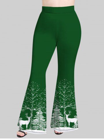 Plus Size Christmas Tree Snowflake Elk Print Pull On Flare Pants - Deep Green - L