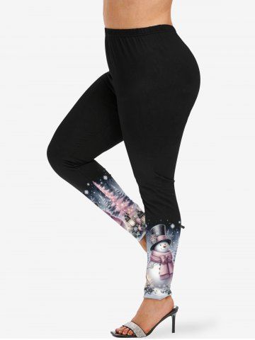 Plus Size Christmas Tree Snowman Snowflake Flowers Glaxy Print Leggings - Black - L