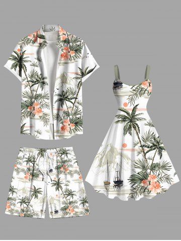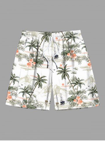 Plus Size Coconut Tree Hibiscus Flowers Sun Mountain Print Hawaii Beach Shorts For Men - White - 3xl