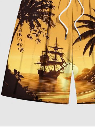 Plus Size Coconut Tree Sun Sailboat Print Hawaii Beach Shorts For Men - Yellow - 6xl