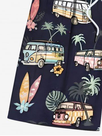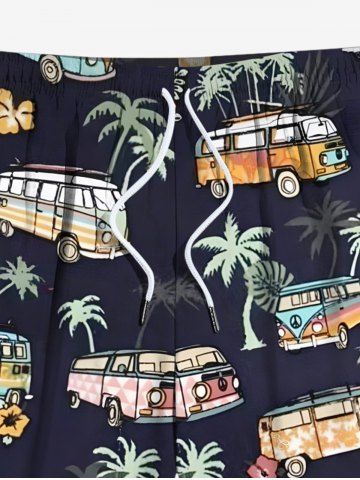 Plus Size Coconut Tree Tropical Leaf Flower Bus Print Hawaii Drawstring Beach Shorts For Men - Black - 8xl