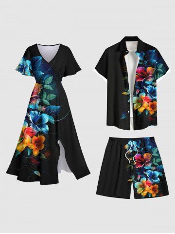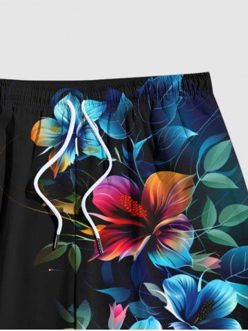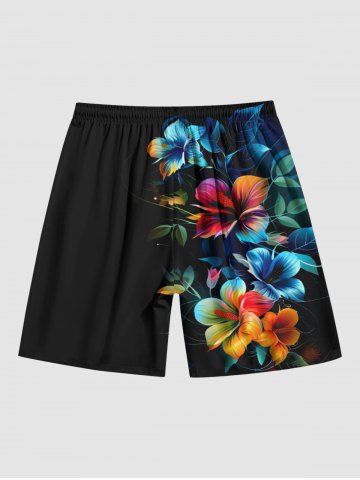 Plus Size Colorful Hibiscus Flowers Leaf Print Hawaii Beach Shorts For Men - Black - 6xl