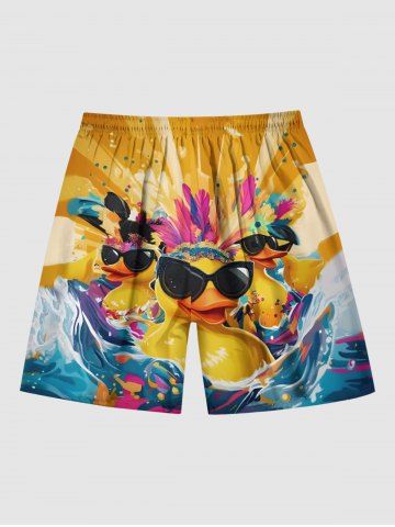 Plus Size Ducks Feather Sea Waves Paint Splatter Print Hawaii Beach Shorts For Men - Yellow - 2xl