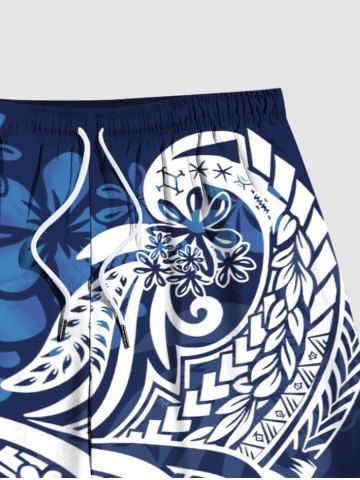 Plus Size Floral Curve Print Hawaii Ombre Drawstring Beach Shorts For Men - Blue - 4xl