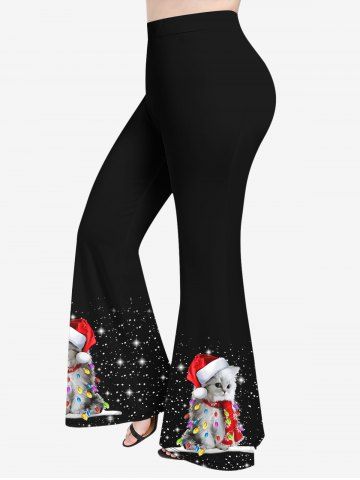 Plus Size Glitter Christmas Hat Light Cat Fragmentation Print Flare Pants - Black - M