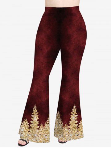 Plus Size Glitter Christmas Tree Print Ombre Pull On Flare Pants - Deep Red - S