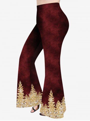 Plus Size Glitter Christmas Tree Print Ombre Pull On Flare Pants - Deep Red - 1x