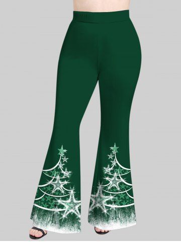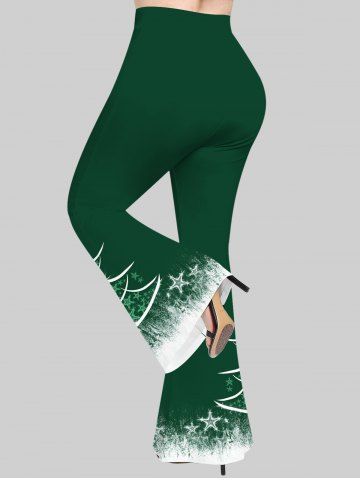 Plus Size Glitter Pentagram Christmas Tree Painting Splatter Print Pull On Flare Pants - Deep Green - S