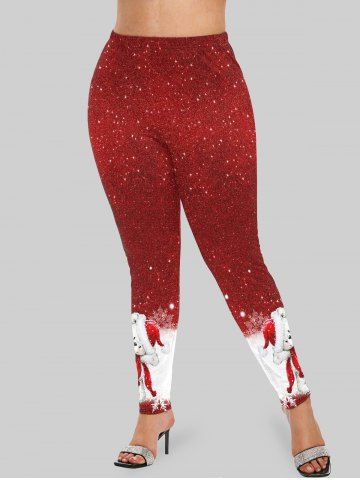 Plus Size Glitter Sparkling Christmas Hat Bear Snowflake Gift Box Sequins Print Skinny Leggings - Red - 1x