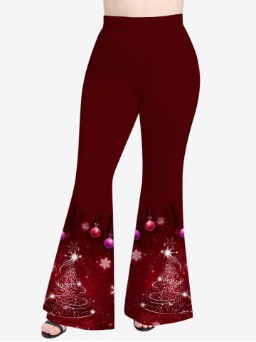 Plus Size Glitter Sparkling Christmas Tree Ball Snowflake Galaxy Print Ombre Pull On Flare Pants - Deep Red - 2x
