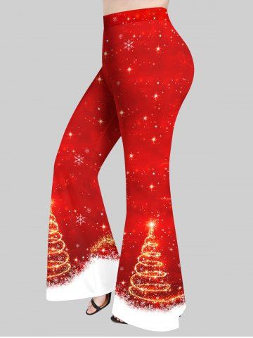 Plus Size Glitter Sparkling Christmas Tree Snowflake Print Flare Pants - Red - L