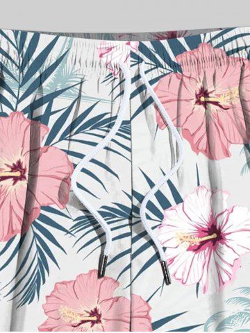 Plus Size Hibiscus Flowers Tropical Leaf Coconut Tree Print Hawaii Beach Shorts For Men - White - 4xl