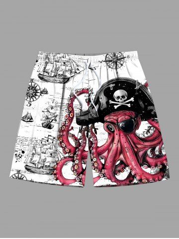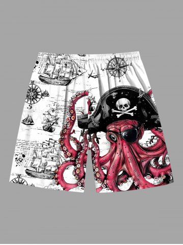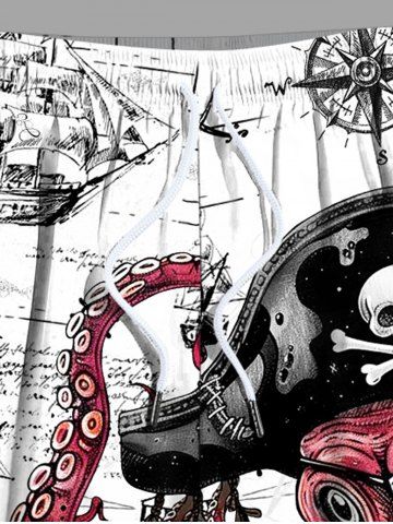 Plus Size Octopus Pirate Ship Rudder Cruise Print Hawaii Beach Shorts For Men - White - M