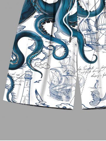 Plus Size Octopus Sailboat Starfish Mermaid Cruise Print Hawaii Beach Shorts For Men - White - 7xl