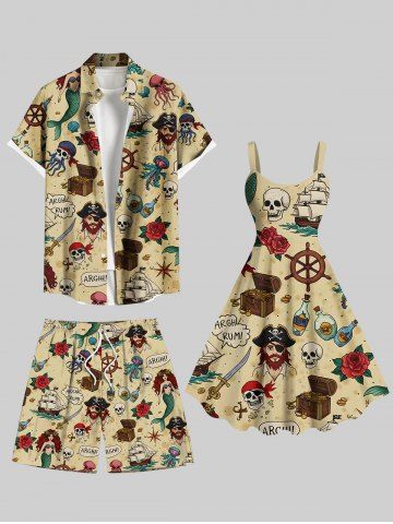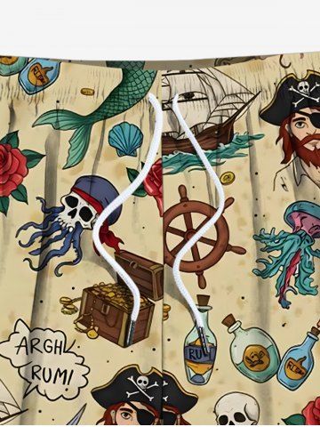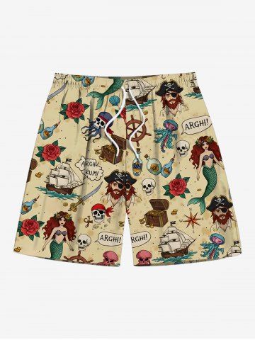 Plus Size Rose Flower Skulls Pirate Mermaid Cruise Print Hawaii Beach Shorts For Men - Light Coffee - Xl