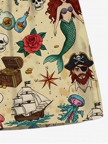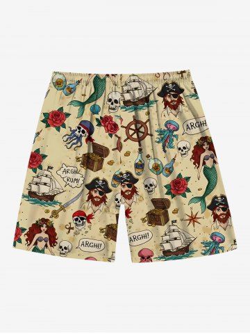 Plus Size Rose Flower Skulls Pirate Mermaid Cruise Print Hawaii Beach Shorts For Men - Light Coffee - 5xl