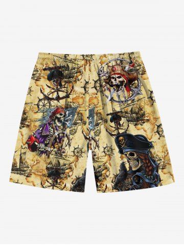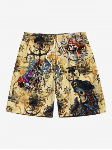 Plus Size Skull Pirate Ship Rudder Map Print Hawaii Beach Shorts For Men - Deep Yellow - 5xl