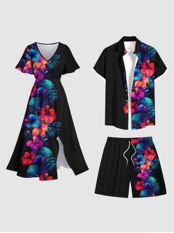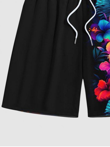 Plus Size Tropical Leaf Hibiscus Flower Print Hawaii Beach Shorts For Men - Black - 6xl