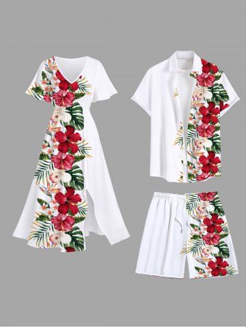 Plus Size Tropical Leaf Hibiscus Flowers Print Hawaii Beach Shorts - White - M