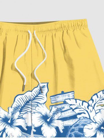 Plus Size Tropical Leaf Hibiscus Flowers Turtle Colorblock Print Hawaii Beach Shorts For Men - Yellow - 2xl