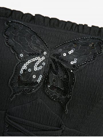 Cold Shoulder Butterfly Applique Lace Up Textured Layered A Line Cami Dress - Black - S