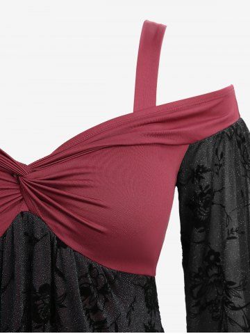 Cold Shoulder Flare Sleeve Glitter Flower Flocking High Low Asymmetric Twist Dress - Black - Xl