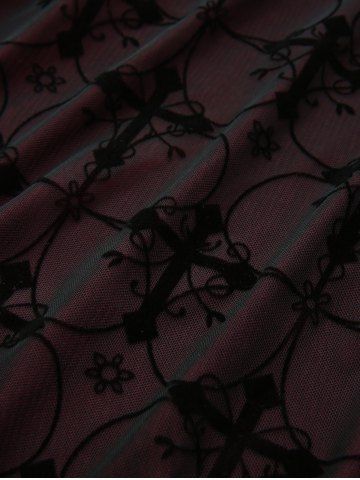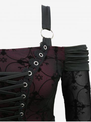 Cross Flocking Mesh Grommets Lace Up Flare Sleeves Cold Shoulder Dress - Black - M