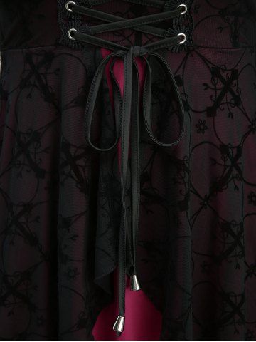 Cross Flocking Mesh Grommets Lace Up Flare Sleeves Cold Shoulder Dress - Black - Xl