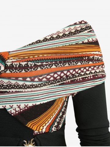 Ethnic Pattern Print Sun Buckle Twist Ruffles Turn Down Shoulder Asymmetrical Dress - Black - L