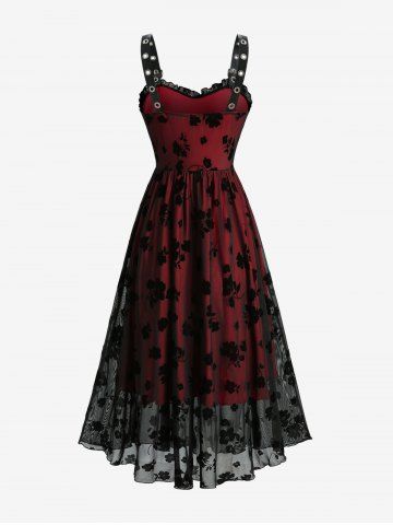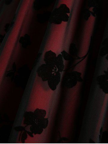 Flower Flocking Overlay Layered PU Strap A Line Dress - Black - S