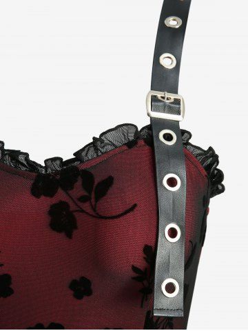 Flower Flocking Overlay Layered PU Strap A Line Dress - Black - Xl