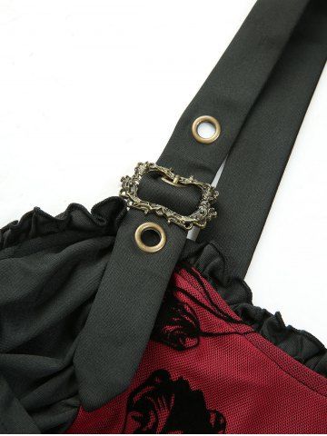 Flowers Flocking Mesh Ruched Crisscross Ruffles Asymmetrical Tank Dress - Red Wine - M