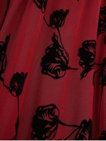 Flowers Flocking Mesh Ruched Crisscross Ruffles Asymmetrical Tank Dress - Red Wine - L