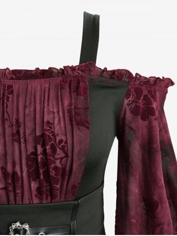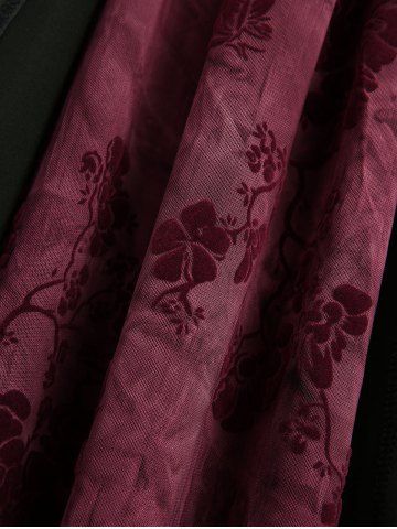 Flowers Flocking Mesh Ruffles Ruched Panel Cold Shoulder Tulip Hem Flare Sleeves Dress - Deep Red - Xxxl