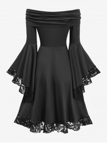 Gothic Flower Lace Trim Off The Shoulder Flare Sleeves A Line Dress - Black - M
