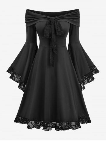 Gothic Flower Lace Trim Off The Shoulder Flare Sleeves A Line Dress - Black - Xxl