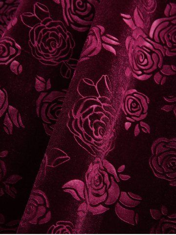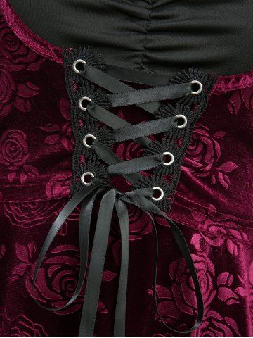 Lace Flare Sleeve Rose Flower Velvet Embossed Lace-up Ruched 2 in 1 A Line Dress - Deep Red - L