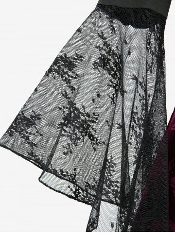 Lace Flare Sleeve Rose Flower Velvet Embossed Lace-up Ruched 2 in 1 A Line Dress - Deep Red - Xl