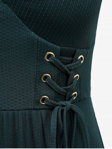 Lace Up Grommets Ruffles Ruched Puff Sleeves Textured Dress - Deep Green - M