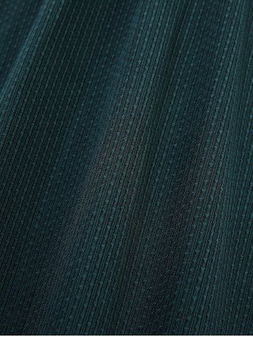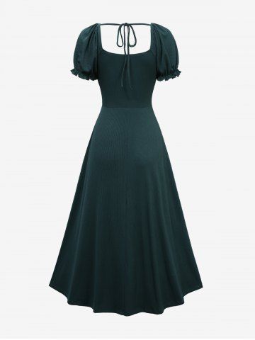 Lace Up Grommets Ruffles Ruched Puff Sleeves Textured Dress - Deep Green - L