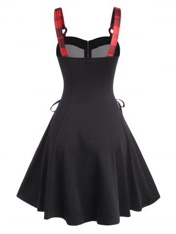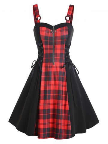 O Ring Plaid Half Zip Lace Up Dress - Red - S
