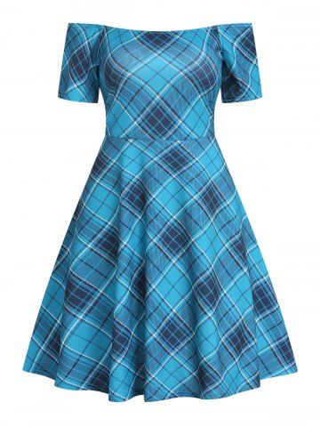Casual Dresses > Plaid Print Off the Shoulder High Waisted Dress and Lace Up Solid Color Tank Dress Two Piece Set