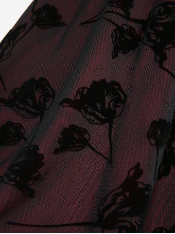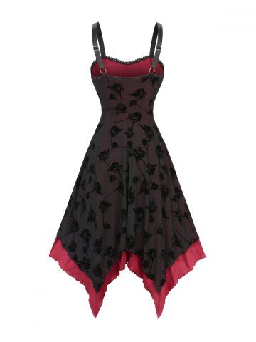 Rose Flower Lace Flocking Lace-up Belted Layered Handkerchief Asymmetric Dress - Black - Xl