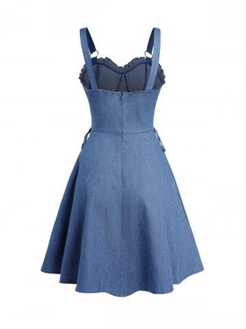 Ruffle Hem Empire Waist Lace Up Sleeveless A Line Short Denim Dress - Blue - S
