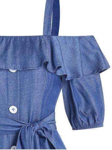 Solid Color Casual Cold Shoulder Flounce Button A Line Midi Summer Dress - Deep Blue - Xl