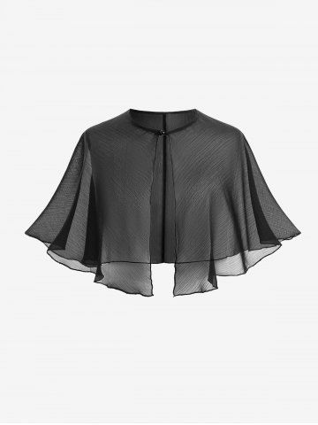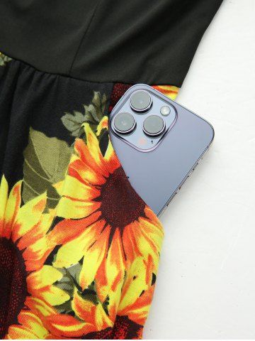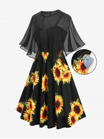 Sunflower Print Pocket A Line Cami Dress and Textured Cape Cloak Set - Black - Xl