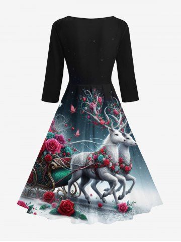 Christmas Elk Rose Flower Butterfly Printed Ombre Midi 50's Vintage A Line Dress - Black - S