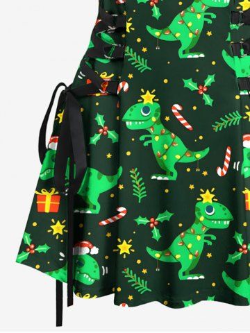 Christmas Holly Fruit Star Dinosaur Candy Print Lace Up Tank Dress - Green - Xxl