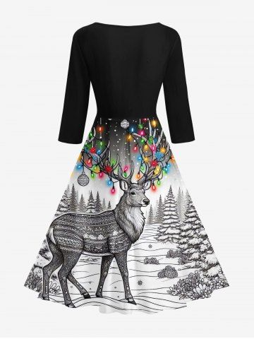 Colorful Christmas Light Elk Tree Ball Galaxy Print Midi 50's Vintage Dress - Black - 2xl